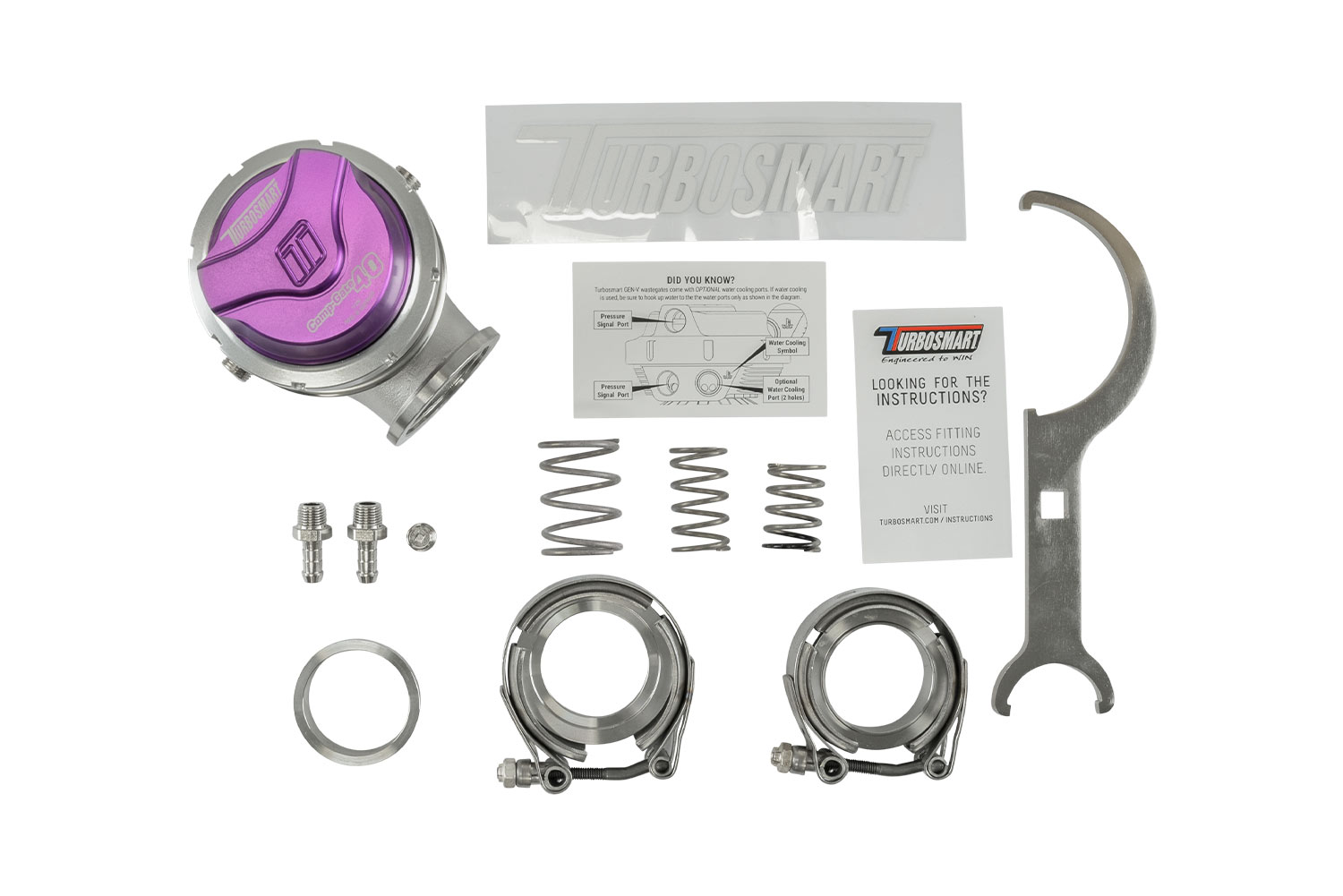 A direct fit upgrade to all Gen4 Turbosmart wastegates and feature our unique collar-locking system, variable actuator cap and base for easy, 360-degree optional routing of reference hoses, strap-type V-band clamps, optional liquid-cooling provision, 1/8″ NPT reference ports and are provided with the full range of available springs.