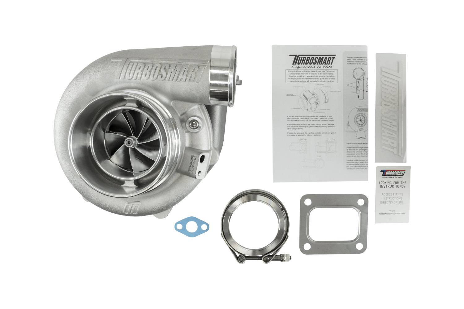 Every Turbosmart turbocharger comes standard with everything you need for installation, weld flanges, V-band clamps, gaskets, oil feed and drain fittings are included.