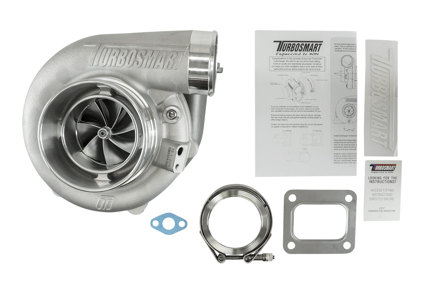 Every Turbosmart turbocharger comes standard with everything you need for installation, weld flanges, V-band clamps, gaskets, oil feed and drain fittings are included.